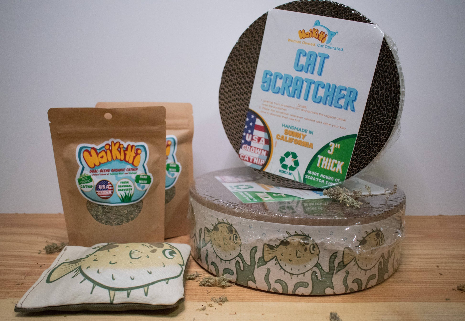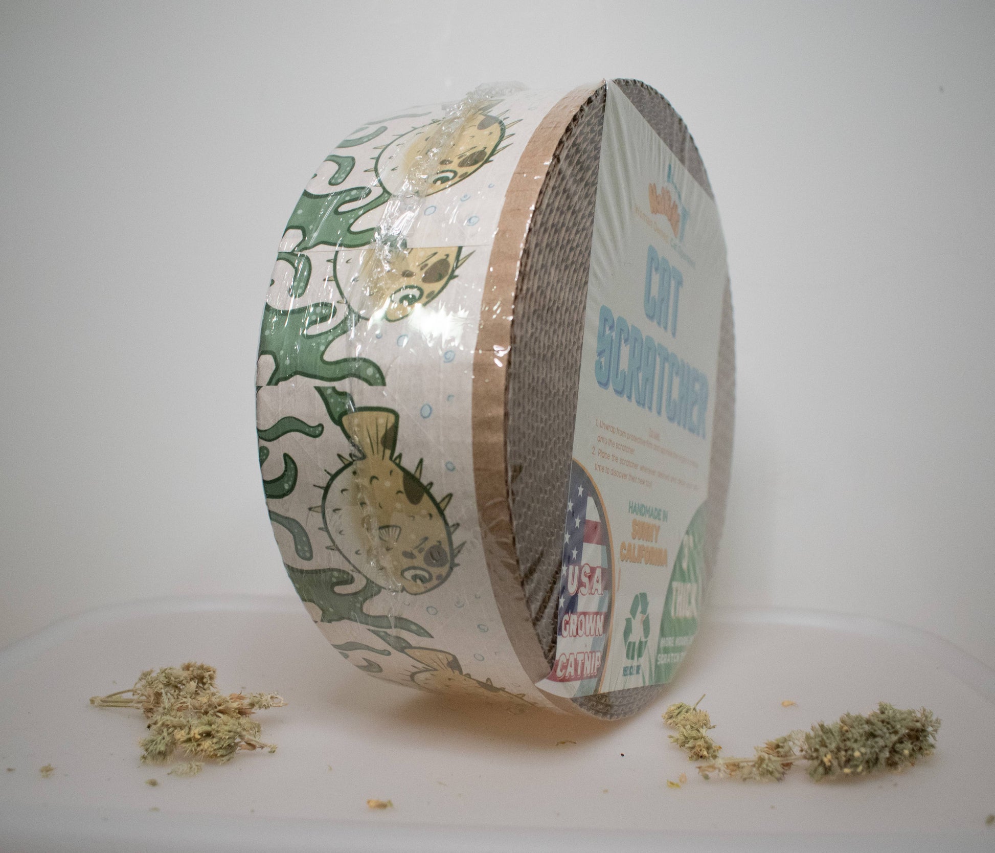 MATERIALS: HaiKitti Dual-Blend Catnip sample (USA-grown, organic, seasonal harvests and blended in-house) Corrugated Cardboard (recyclable) Decorative tape (biodegradable)