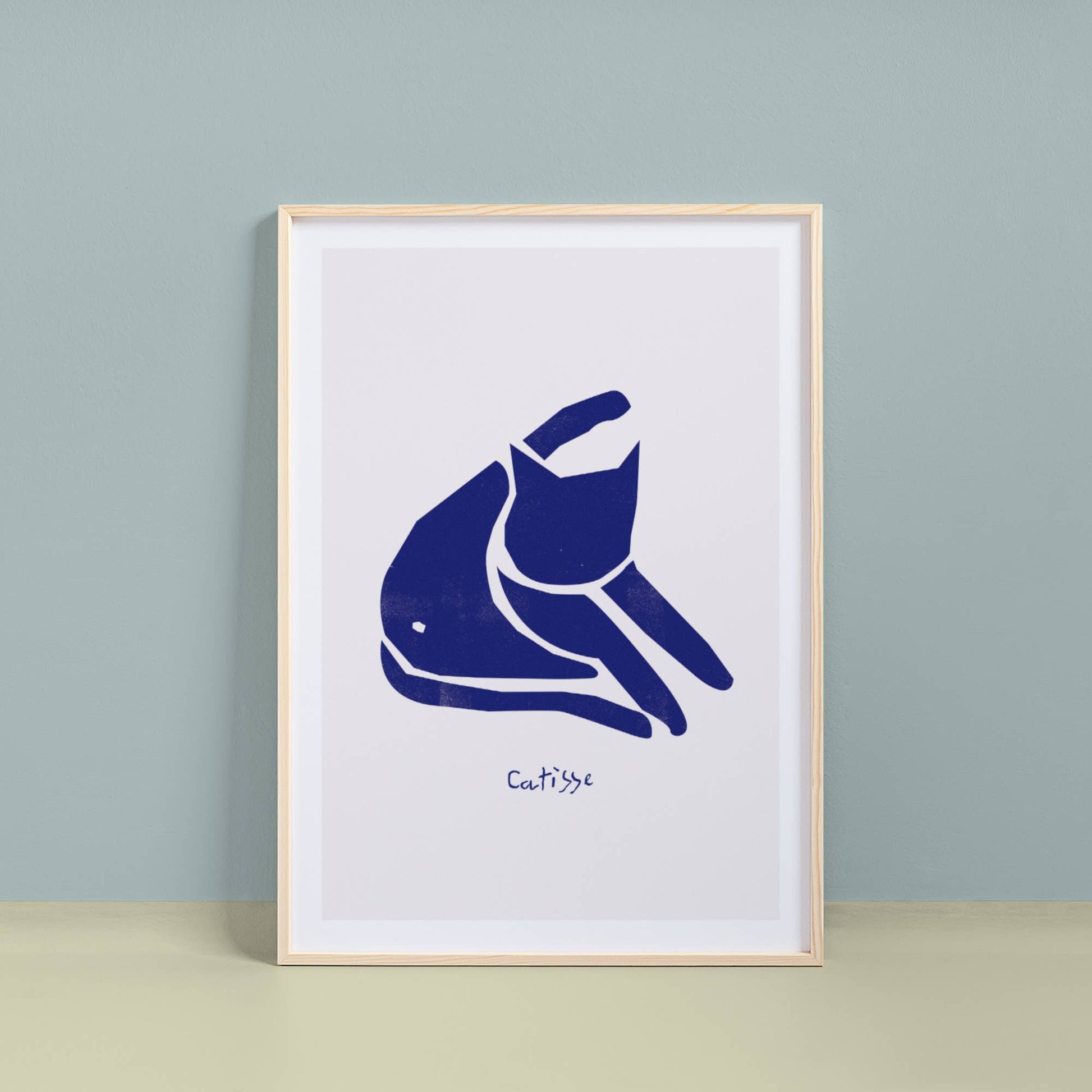 Inspired by the work of the artist 'Henri Matisse'. This print is a fun whisker twisting take on the artwork 'Blue Nude', now reimagined as 'Blue Catisse'