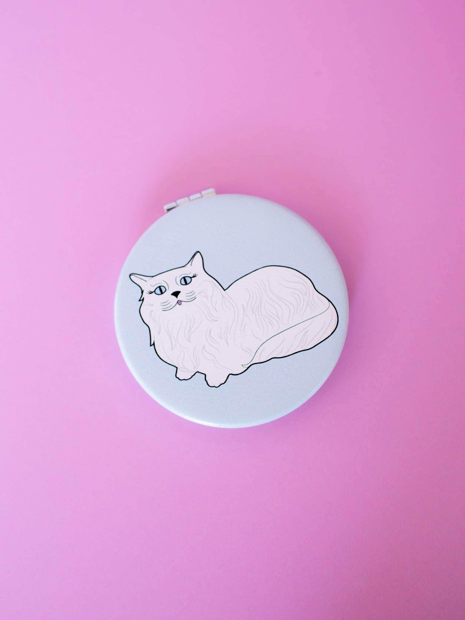 This mirror is made of blue leatherette and features Miss Kitty on one side and a bow on the other. Open it up and both sides of the compact are mirrored.