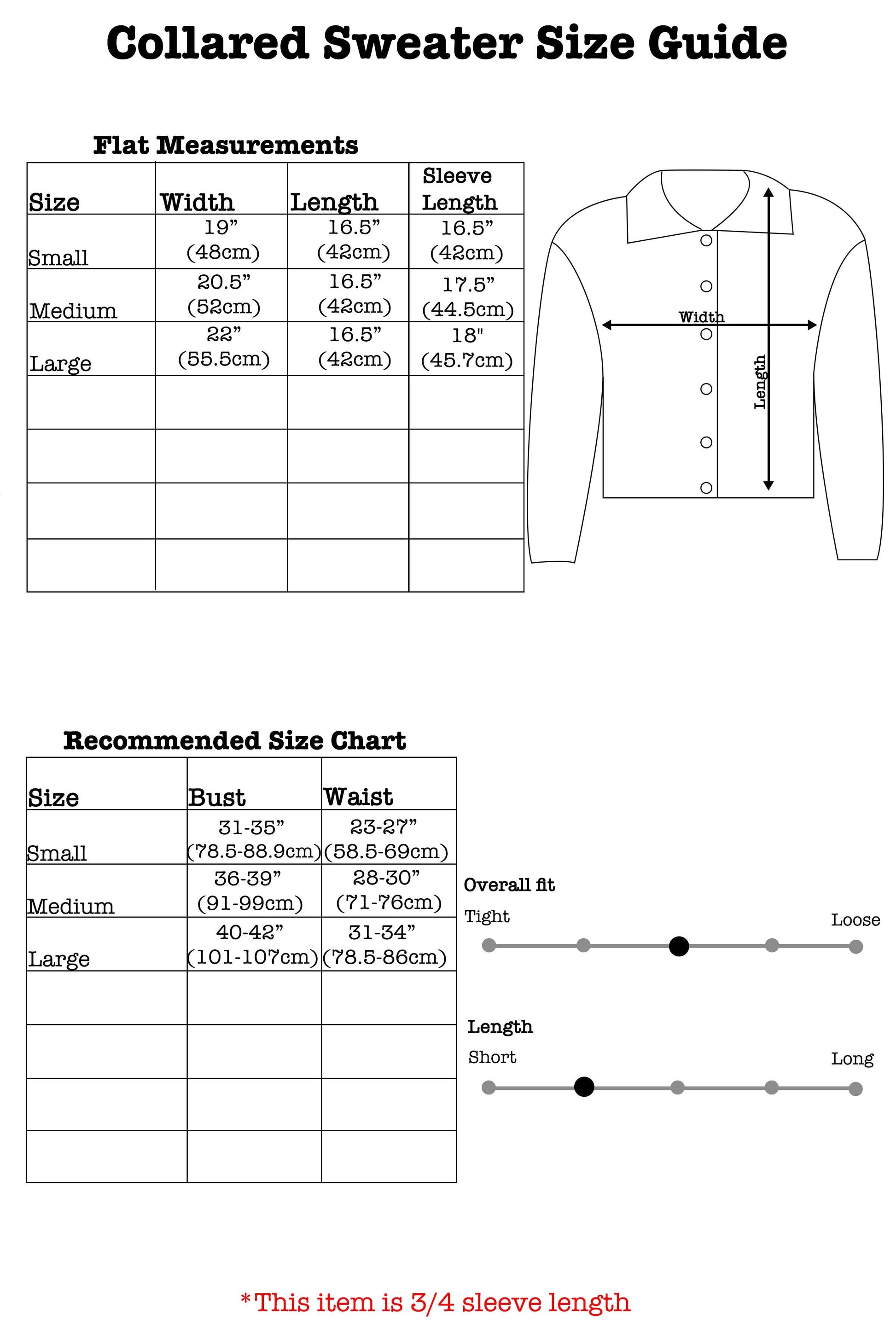 -Actual shirt measurements- Measurements are in inches with shirt laying flat Small / Body Width 19” (48cm) Body Length 16.5”(42cm) / Sleeve Length 16.5”(42cm) Medium / Body Width 20.5”(52cm) Body Length 16.5”(42cm) / Sleeve Length 17.5”(44.5cm) Large / Body Width 22” (55.5cm) Body Length 16.5”(42cm) / Sleeve Length18"(45.7cm) - -Recommended size chart- Small Bust 31-35” (78-88cm) / waist 23-27” (58-69cm) Medium Bust 36-39” (89-99cm) / waist 28-30” (70-76cm) Large Bust 40-42” (100-107cm) / waist 31-34” (77-86cm)
