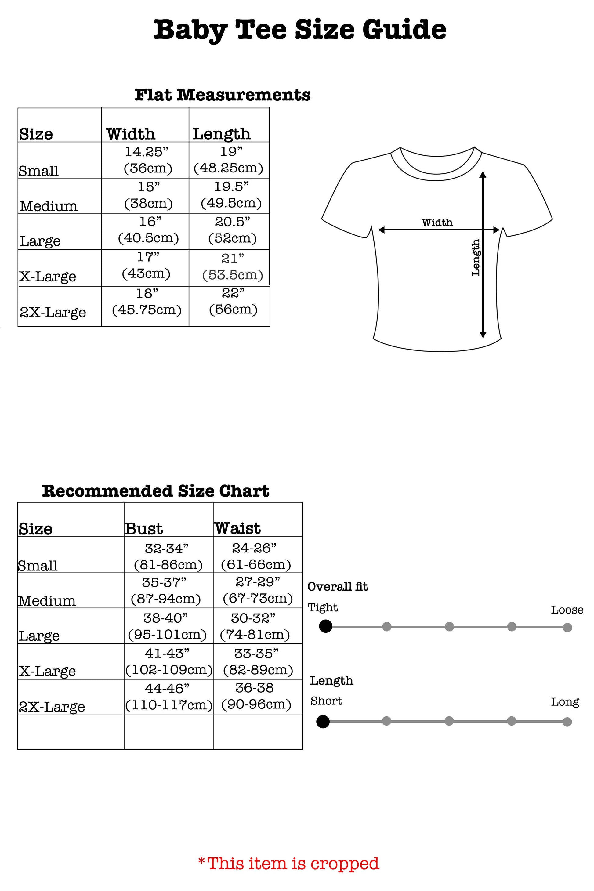Measurements are in inches with shirt laying flat Small Body Width 14.25" (36 cm) Body Length 19" (48.25 cm) Medium Body Width 15" (38 cm) Body Length 19.5" (49.5 cm) Large Body Width 16" (40.5 cm) Body Length 20.5" (52 cm) Extra Large Body Width 17" (43 cm) Body Length 21" (53.5 cm) 2X-Large Body Width 18" (45.75 cm) Body Length 22" (56 cm) - Recommended size chart- Small Bust 32-35” (80-89cm) / waist 24-27” (61-68cm) Medium Bust 36-38” (90-97cm) / waist 28-30” (69-76cm) Large Bust 39-41” (98-104cm) / waist 31-33” (77-84cm) Extra Large Bust 42-45” (105-114cm) / waist 34-37” (85-95cm) 2X-Large Bust 46-48” (115-123cm) / waist 38-40 (96 -103cm)