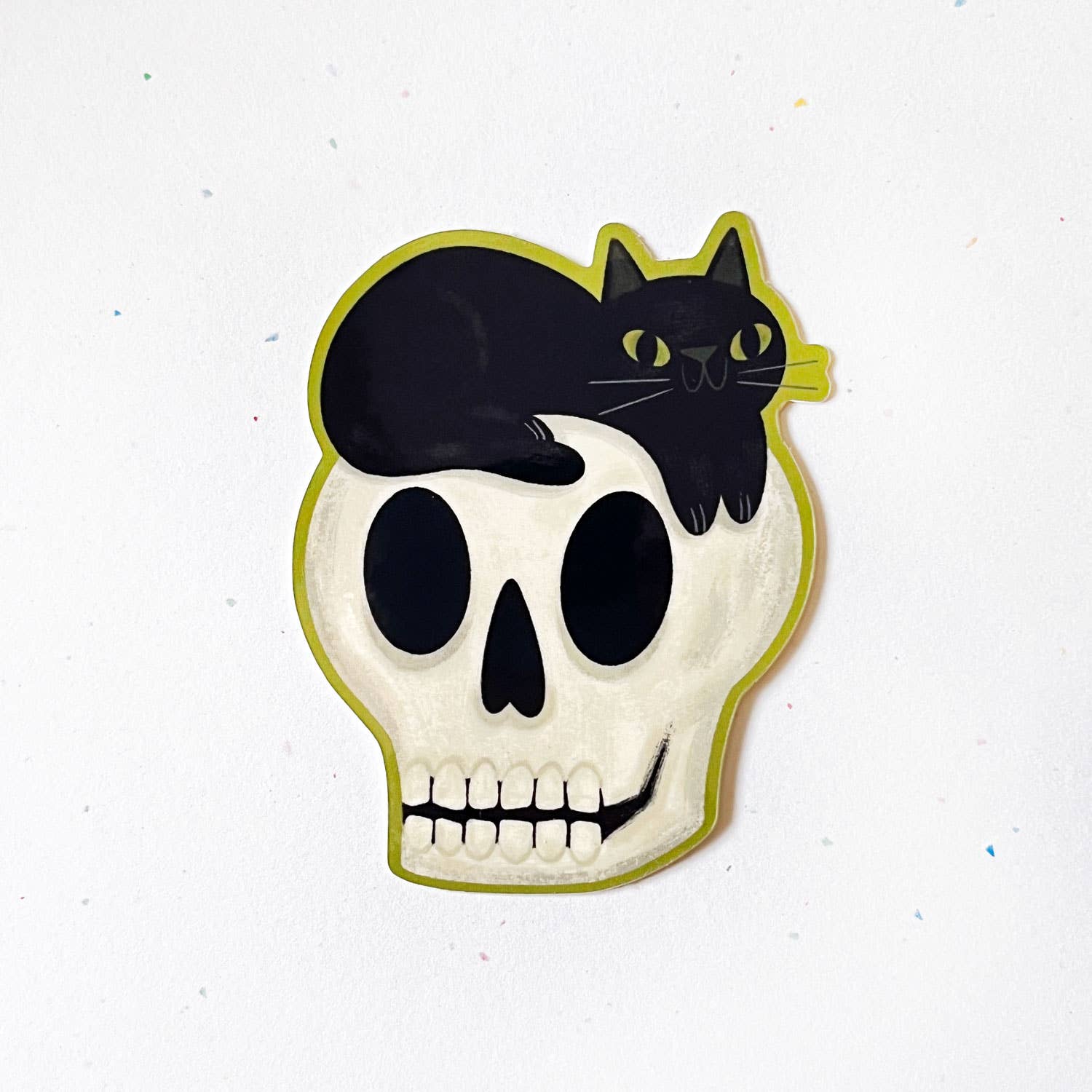 Black cat & skull. 1 glossy vinyl sticker. Scratch-proof and weatherproof. 2.5in x 3.2in. In an effort to reduce packaging waste, stickers do not come individually packaged.