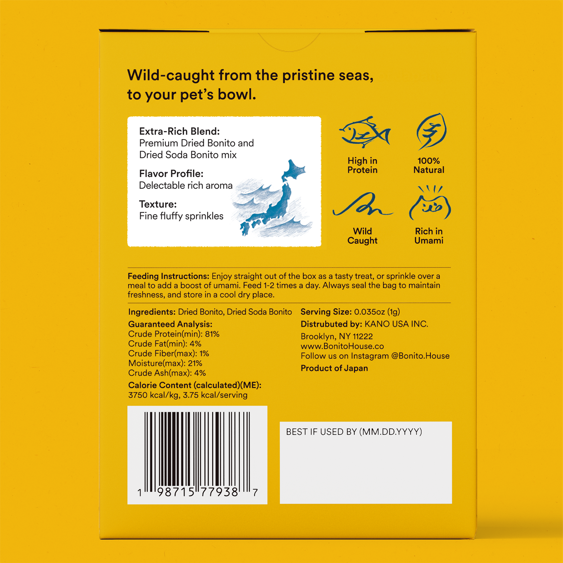 Made from wild-caught bonito, Bonito House Umami Meal Toppers deliver rich umami, natural protein, and an irresistible aroma that cats love. Each box includes 10 single-serve bags to maintain fresh, fluffy flakes in every bite.
